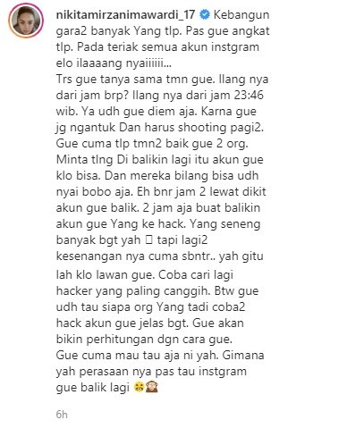 Nikita pun langsung menghubungi beberapa temannya untuk mengembalikan Instagramnya. Hingga dalam kurun waktu dua jam, akun Instagram miliknya itu kembali seperti semula.