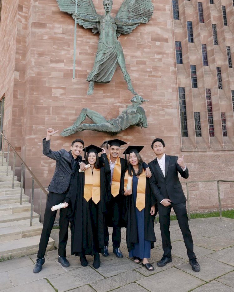 Terbang jauh ke London, ada Shaloom Razade, putri Wulan Guritno yang sudah menyelesaikan studi S-1nya disana. Ia terlihat berfoto di depan halaman kampus bersama teman-temannya.