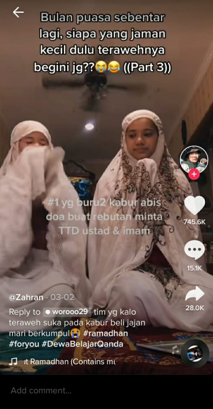 Tiktokers ini membagikan pengalaman masa kecilnya di bulan ramadhan. Seperti halnya di video ini, tiktokers bernama Zahran ini membagikan pengalamannya saat sholat tarawih. Banyak kejadian lucu yang membuat para netizen pun merindukan sholat tarawih.