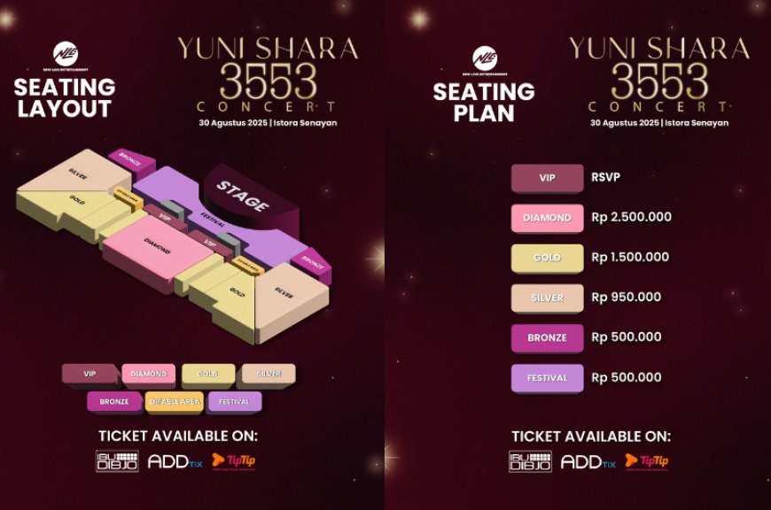Informasi lebih lanjut mengenai tiket dan detail acara dapat ditemukan melalui akun Instagram resmi Yuni Shara di @yunishara36 dan akun @3553concert.official dan @newliveentertainment.