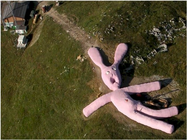 Tampak sebuah boneka kelinci ukuran 200 kaki yang terletak di Gunung Colleto Fava setinggi 5.000 kaki di wilayah Piedmont Italia Utara. Kelinci ini adalah instalasi seni yang dirajut oleh Gelitin, sebuah kolektif seni Wina. Tujuannya untuk membiarkan turis bermain dengan memanjat dan tidur di atasnya.