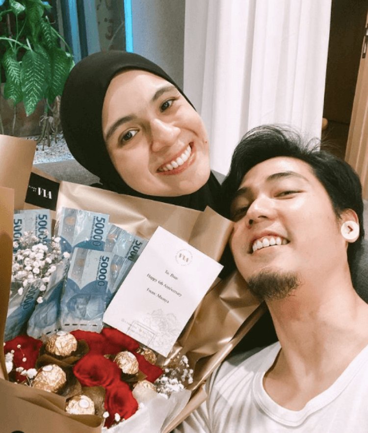 Saat merayakan anniversary yang ke-6, Kinos memberikan buket bunga berbentuk uang dan cokelat. Pasangan ini pun mengunggah momen tersebut sambil menunjukan senyum lebar mereka. Manis banget ya pasangan Nycta Gina dan Rizky Kinos!