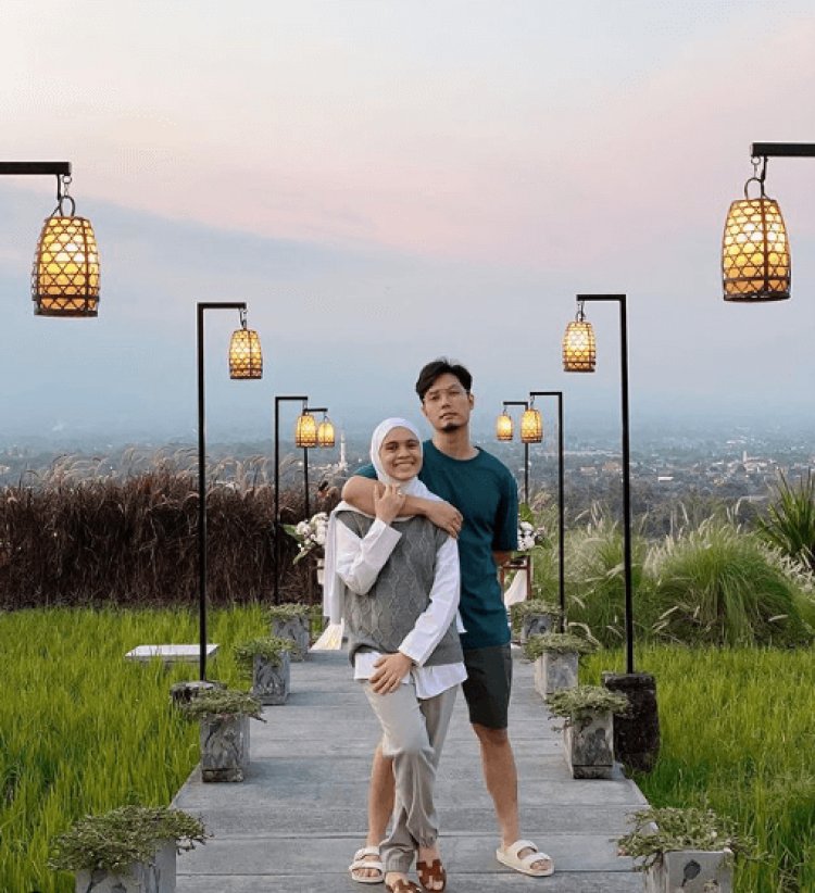 Dengan latar belakang pemandangan sawah yang hijau, Nycta Gina dan Rizky Kinos saling memeluk mesra. Gina mengungkapkan jika hubungannya dengan sang suami tak bisa romantis. Terlihat dalam foto, gaya romantis mereka malah terlihat kaku. Padahal usia pernikahan mereka sudah 6 tahun lho.