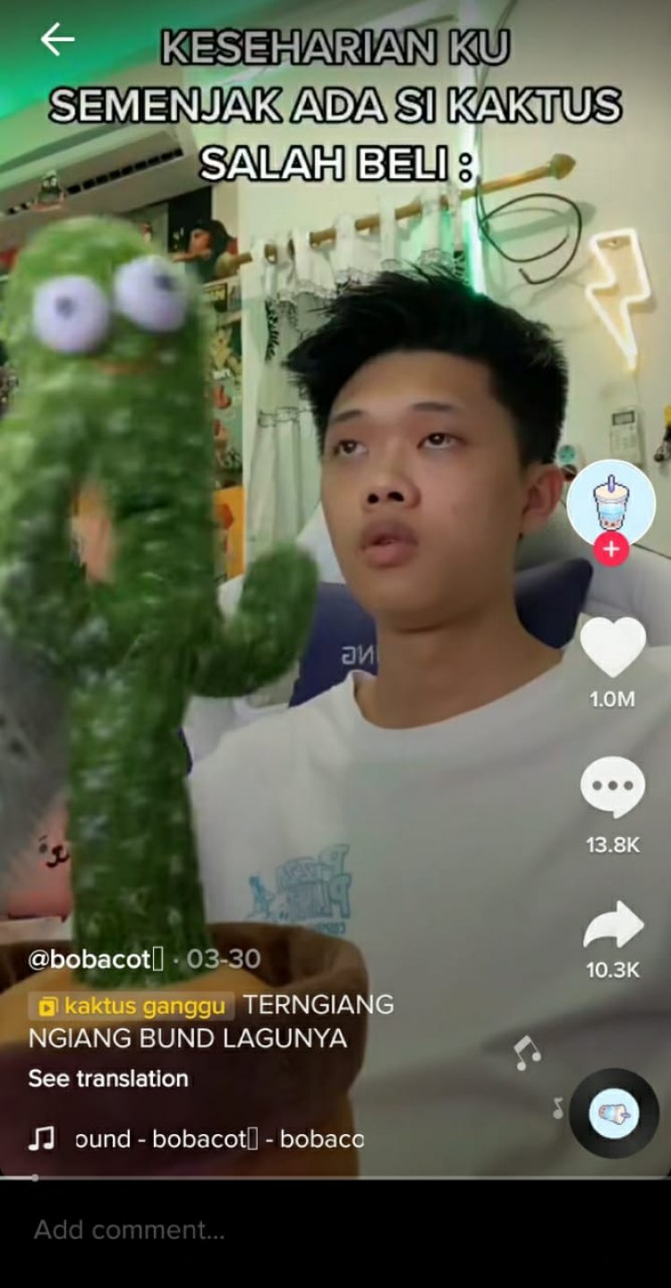 Belakangan ini tiktokers dengan nama akun @bobacot kerap muncul di laman fyp. Ia kesal karena salah membeli mainan pohon kaktus yang sempat viral di tiktok. Aksi kesalnya justru membuat orang tertawa.